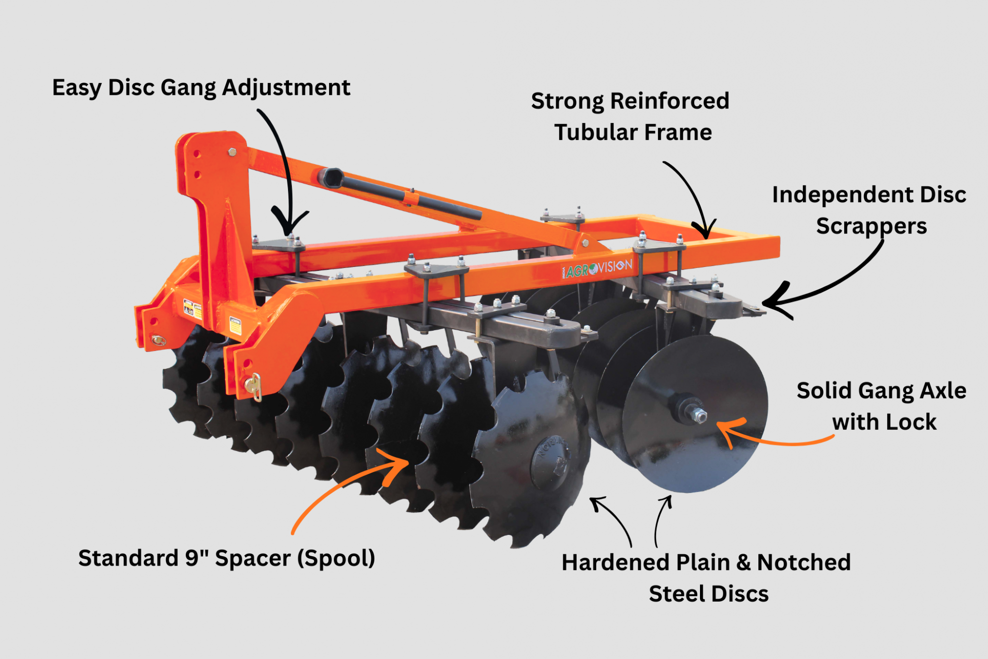 High-quality hardened discs efficiently cut crop residues and mix